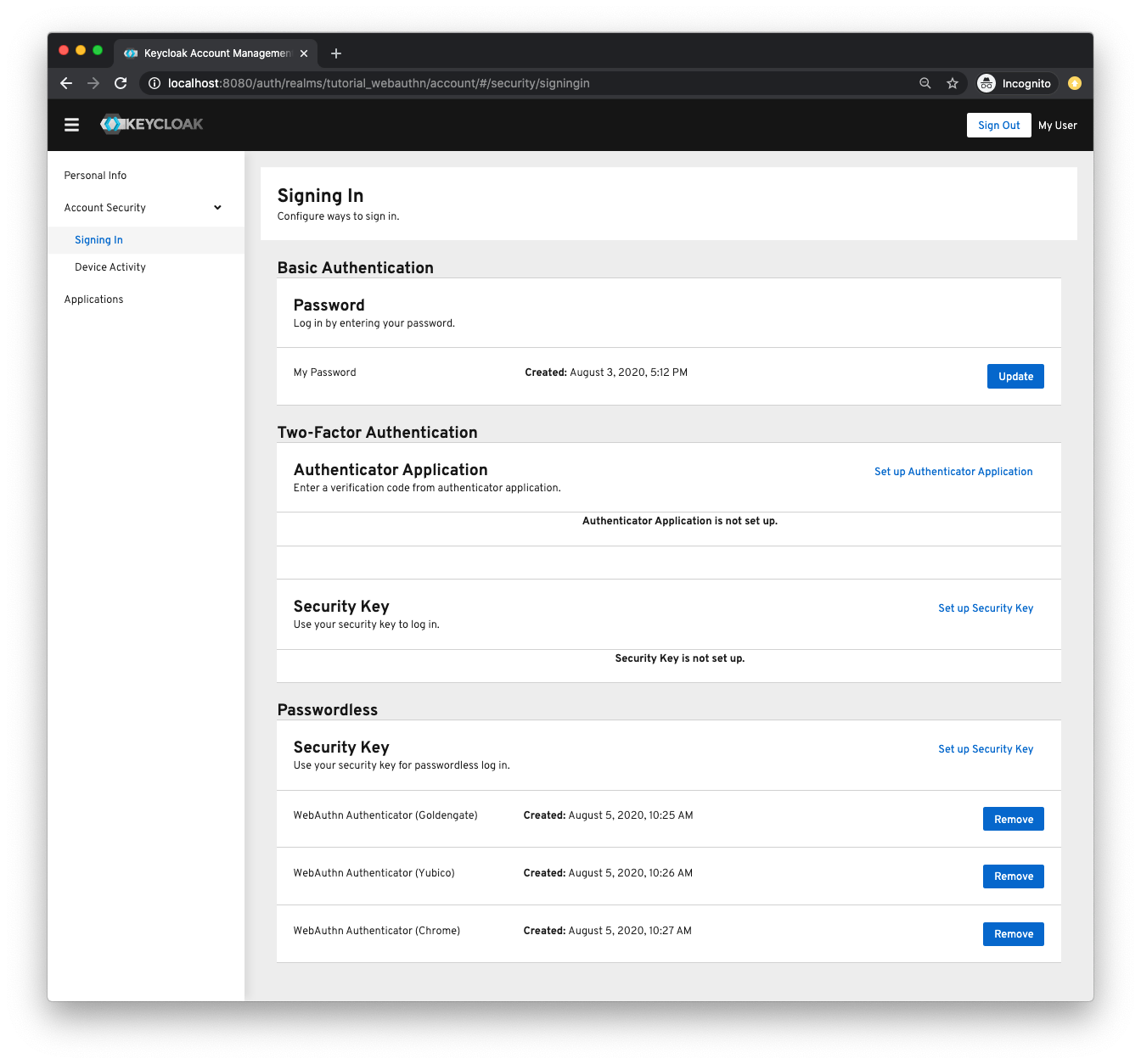 $KCADM update users/$USER_ID -r $REALM_NAME -s firstName="My" -s lastName="User" -s email="[email protected]"This user will be forced to setup a WebAuthn passwordless security key. Additional users can easily be created on the login page.
